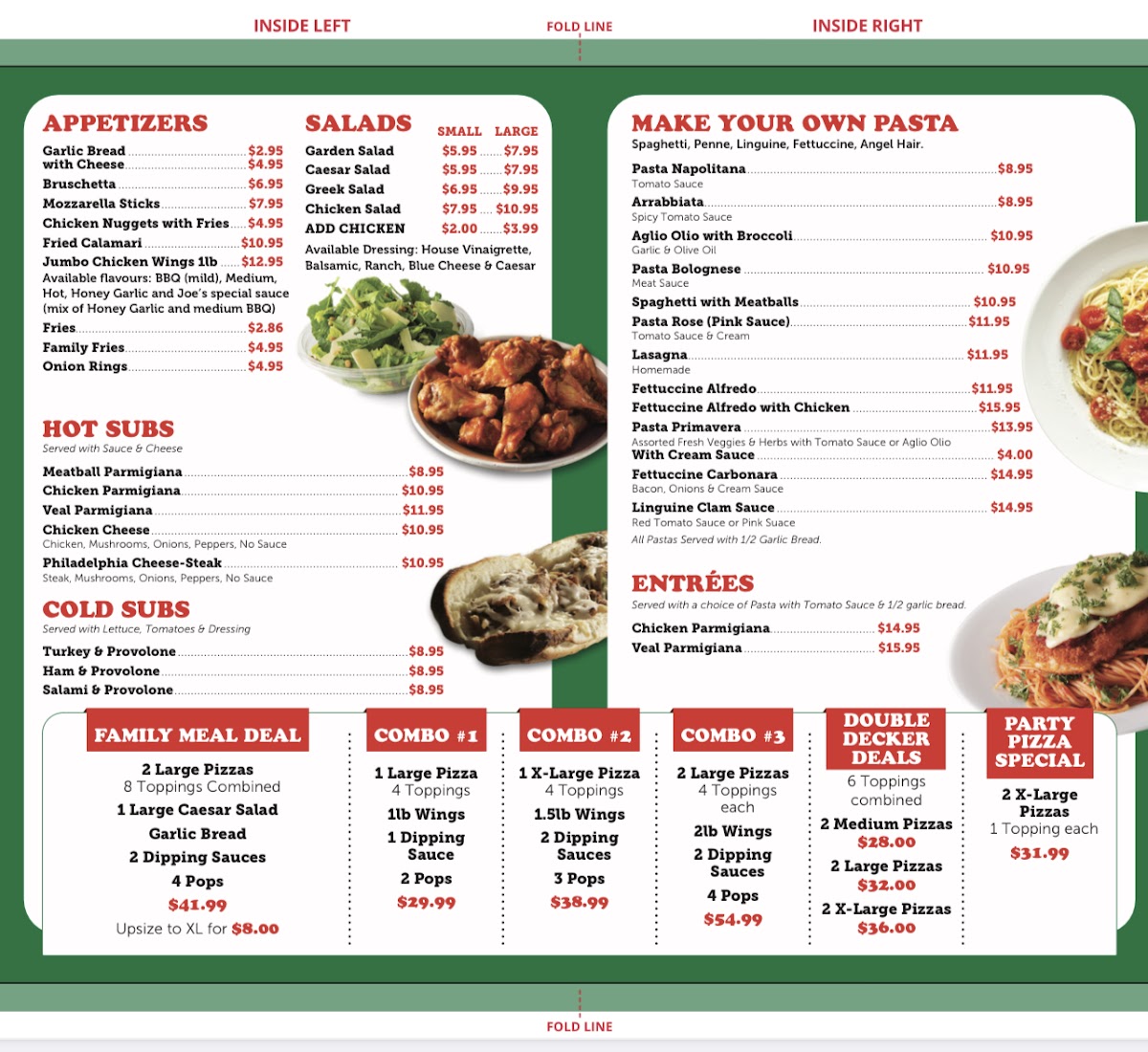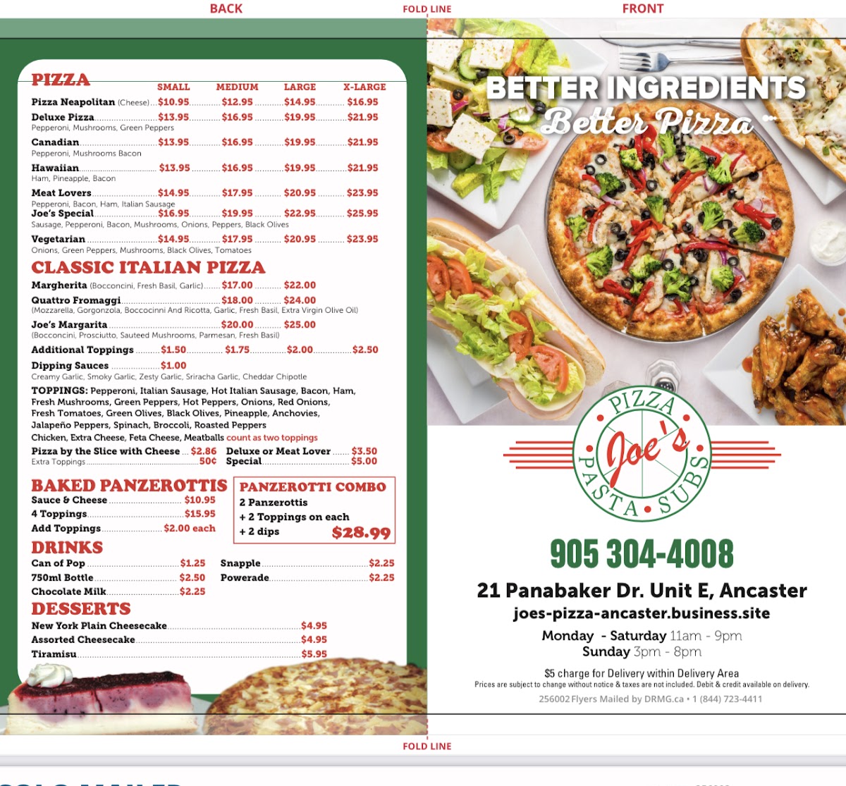 As a final takeaway from my experience reviewing the menu at Joe’s Pizza Ancaster at 21 Panabaker Dr unit E, Ancaster, ON L9G 0A4, the offering feels broad, comforting, and clearly designed to satisfy both families and classic Italian-food lovers. The Specials like Family Meal Deal, Double Decker Deal, and Combo #1, Combo #2, Combo #3 set the tone for value-driven dining, while the Appetizers-from Garlic Bread, Garlic Bread with Cheese, and Bruschetta to Mozzarella Sticks and Chicken Nuggets and Fries-work well as familiar, crowd-pleasing starters. For lighter options, the salad section stands out with clear pricing, including Garden Salad Small $5.95 / Large $7.95, Caesar Salad Small $5.95 / Large $7.95, Greek Salad Small $6.95 / Large $9.95, and Chicken Salad Small $7.95 / Large $10.95, with the flexible Add Chicken Small $2.00 / Large $3.99 option enhancing customization. Sub lovers will appreciate the hearty Hot Subs such as Meatball Parmigiana Sub, Chicken Parmigiana Sub, Veal Parmigiana Sub, Chicken Cheese Sub, and Philly Cheese Steak Sub, alongside simpler Cold Subs like Turkey and Provolone Sub, Ham and Provolone Sub, and Salami and Provolone Sub. The pasta menu invites personalization with Make Your Own Pasta choices-Spaghetti, Penne, Linguine, Fettuccine, or Angel Hair-paired with sauces like Pasta Napolitana, Pasta Arrabiata, Aglio Olio with Broccoli, Pasta Bolognese, and Spaghetti with Meatballs. For more substantial plates, Entrées such as Chicken Parmigiana and Veal Parmigiana deliver classic Italian comfort. Pizza remains a clear highlight, from Small Napolitan Pizza, Small Deluxe Pizza, Small Canadian Pizza, Small Hawaiian Pizza, and Small Meat Lovers Pizza to the Classic Italian Pizza range featuring Large Margherita Pizza, Large Quattro Formaggi Pizza, and Large Joe’s Margarita Pizza. The menu rounds out nicely with Baked Panzerottis-Sauce and Cheese, 4 Toppings Panzerotti, and 2 Panzerotti (2 toppings on each) + 2 Dips-plus Dipping Sauces, before finishing on a sweet note with Tiramisu, Plain Cheesecake, and Assorted Cheesecake. Overall, the menu feels cohesive and generous, balancing variety, value, and traditional Italian flavors in a way that makes Joe’s Pizza Ancaster an easy, reliable choice.